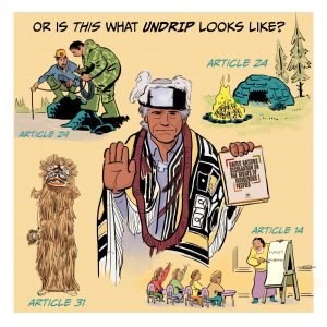 A Home on Native Land student contacted us the other day, pointing to the similarities between our “Doctrine of Discovery” cartoon, which uses the metaphor of the theft of a car to illustrate the illegality that underlies much of land tenure systems in Canada, and the story of Del’s Truck.